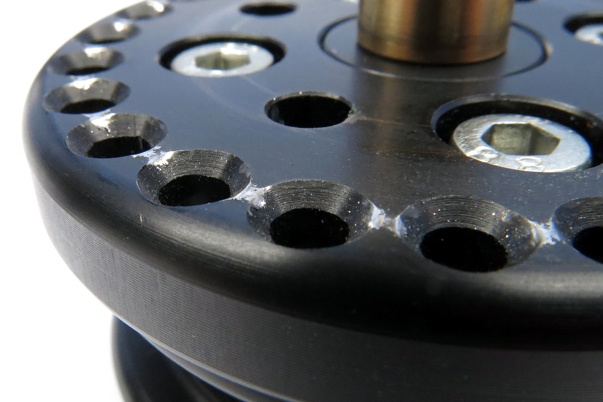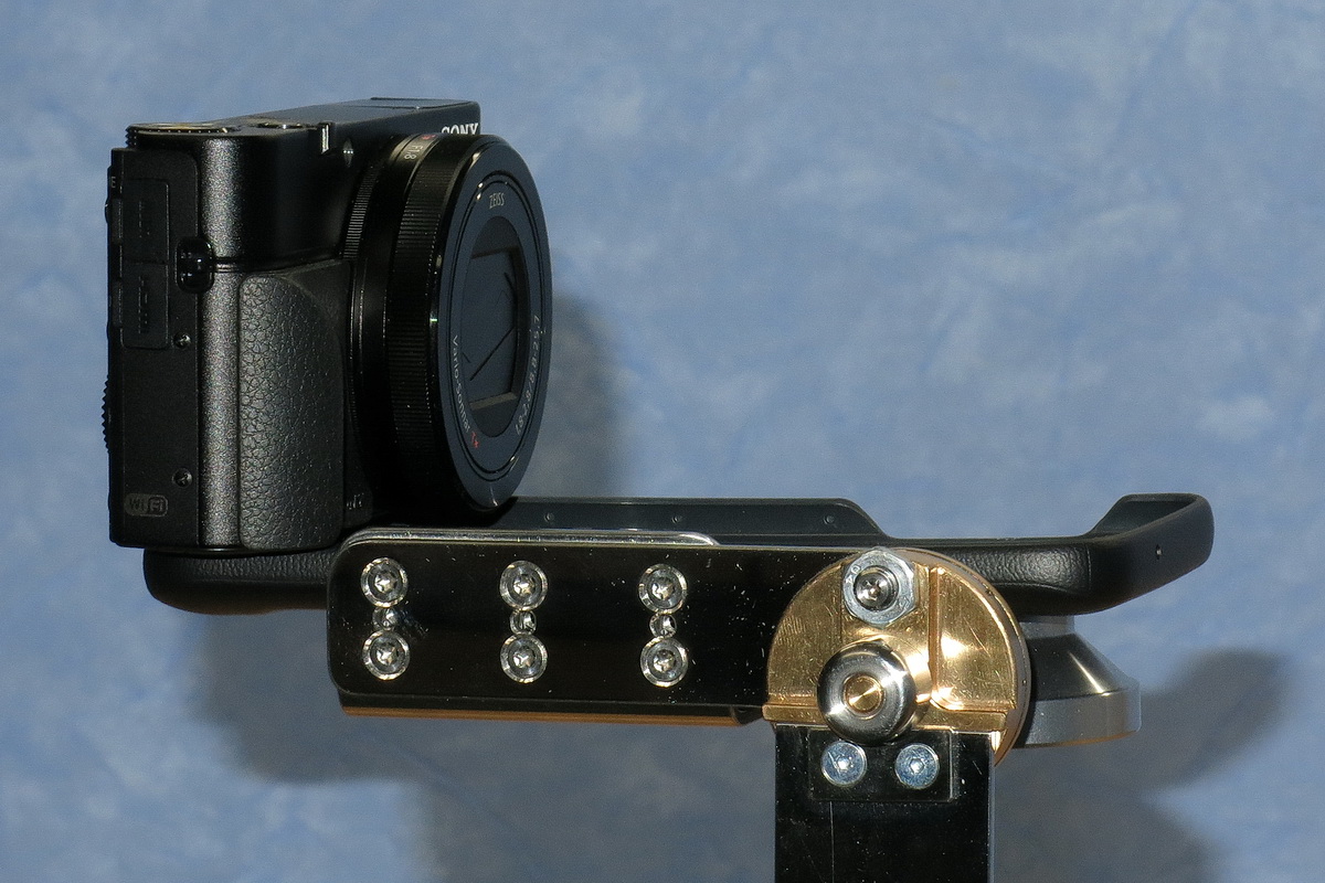 Die selbsthaltende Rastung meines Smartfone-Adapters ist da viellicht ein gutes Beispiel: Sie hält die RX100III sogar dann noch sicher wenn sie ungünstig weit von der Schwenkachse weg steht, wo der (unnötig) längere Hebelarm noch mehr Rastkraft fordert. Und das bei vergleichsweise geringerer Baugröße (in Durchmesser und Stärke) und mit handelsüblichem federndem Druckstück M6, das ich für weniger Überstand lediglich in der Länge etwas abgedreht habe. Das federnde Druckstück kann in der Einschraubtiefe so gekontert werden dass die Rastung annähernd Spielfrei ist. Vorausgesetzt natürlich dass die Rastlöcher gleichmäßig ausgeführt sind. Neben Federkraft und Kugeldurchmesser des Druckstücks spielen vor allem auch Anordnung, Durchmesser und Ausführung der Rastgeometrie, also der Rastbohrungen eine bedeutende Rolle. Bei mir haben sich Bohrungen mit präzisen Kegelsenkungen bewährt. Erreicht die Kugel den großen Durchmesser der Kegelsenkung will die Rastung schon einschnappen. Rasten tut sie wenn die Kugel tangential in der Kegesenkung sitzt. Damit man später alle Rastungen spielfrei einstellen kann müssen die Kegelsenkungen alle exakt gleich ausgeführt werden. Ein gewisses Einlaufen der Schnappkanten beeinträchtigt die Rastung selbst nicht. Die Kugel sitzt eingerastet ringförmig auf der Mantelfläche der Kegelsenkung. Mit ein paar praktischen Versuchen kann man da viel erreichenAußerdem ist es bei der geringen Baugröße des pocketPANO Nodalpunktadapters schwierig, noch größere und stärkere Druckstücke zu integrieren. Bereits jetzt greife ich auf für mich nach Vorgabe gefertigten Federn zurück, da die Standard-Druckstücke (in dieser Größe!) viel zuwenig Kraft und dafür zuviel Spiel haben.