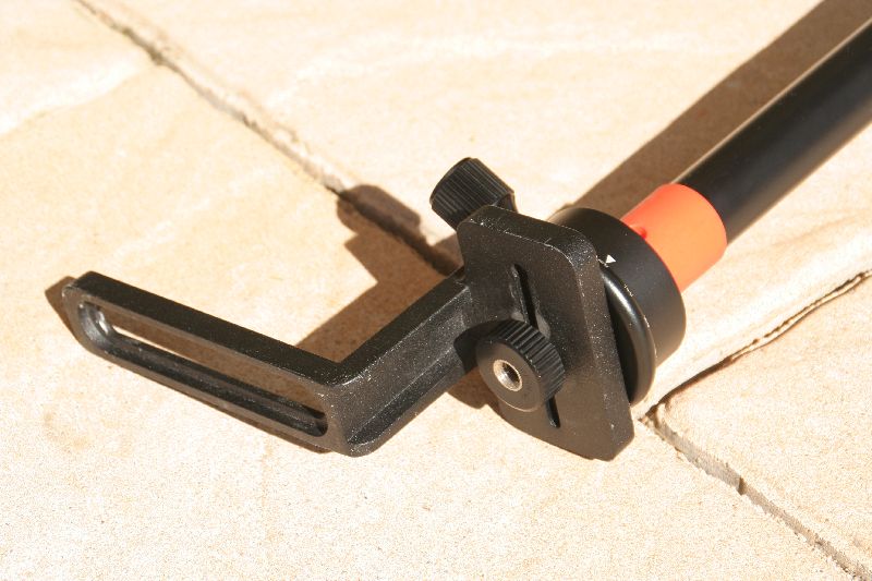 Den Drehteller habe ich wiederum auf eine alte Kamera-Befestigungsplatte von einem alten Repro-Stativ geschraubt. Die erfüllt gleich zwei Dinge: Erstens ist der Drehteller so leicht erhöht vom Boden – so kann man die Skala besser ablesen, wenn die Stange im Gras steht. Und zweitens kann man auf den seitlich abstehenden Bügel steigen und die ganze Stange so stabilisieren.