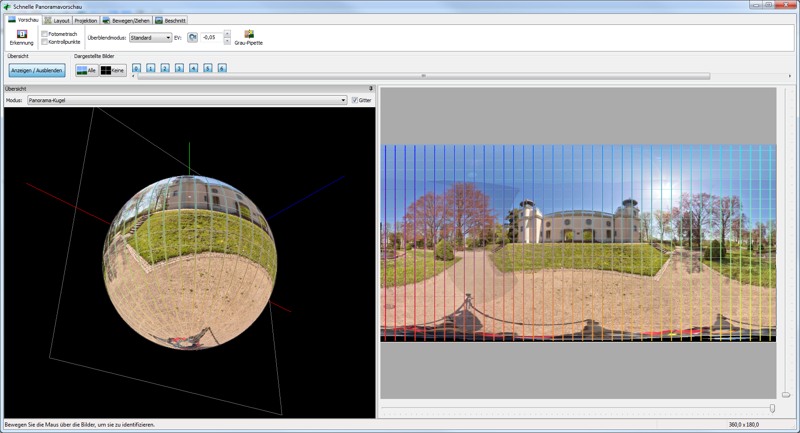 Nettes Gaget im Vorschaufenster ist die freidrehbare Panokugel, man kann ein Gittnetz einblenden lassen und eine Grau Pipette ist neu.