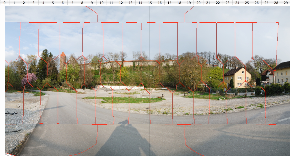 (Orientierung an den Gitterlinien im Sucher) 19000 x 6600 Pixel entspricht 127° x 44° Blickwinkel: