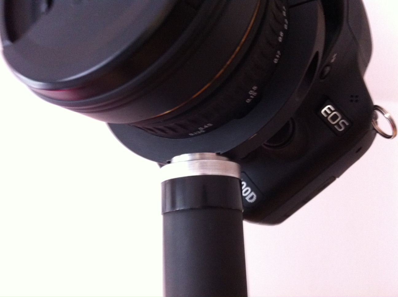 Da braucht man sich nix vorstellen: Ring, unten flach, mit M4-Bohrung. Daran normalerweise ein kleines Ärmchen nach vorne, mit 3/8-Zoll Bohrung für Stativ oder ähnlich. Im Fall des Poles kommt das Ärmchen weg und ich gehe mit dem Mast direkt in die M4-Bohrung. Kamera sitzt also direkt mit dem Ring auf dem Mast. Ich denke ich werde feilen. Für den Sommer kann ich ein paar kräftige Oberarme gebrauchen, macht sichwer was her im Park... :-)