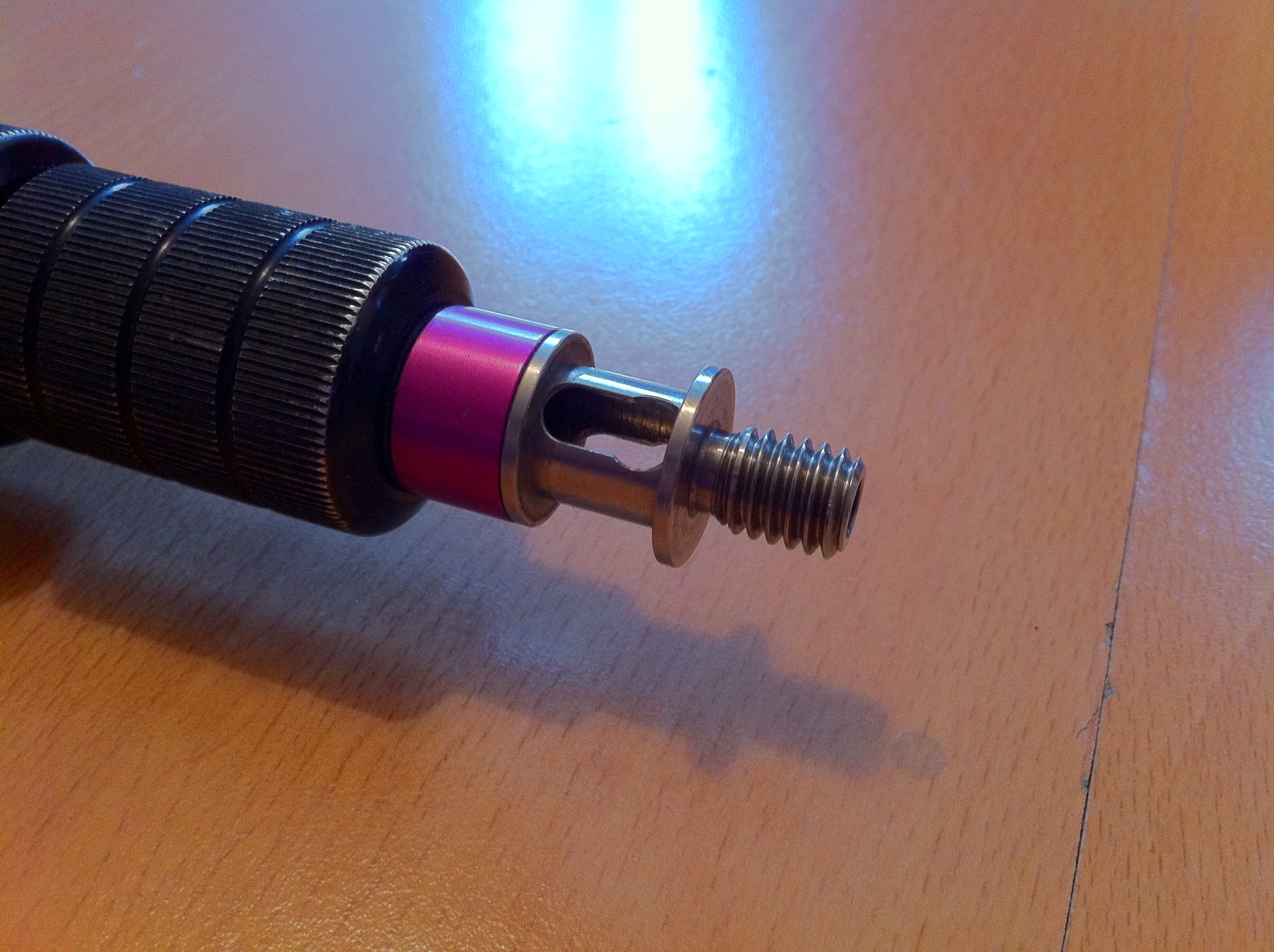- Gewindestift aus Stahl anfertigen lassen, ein Ende mit kleinem, ein Ende mit großem Kameragewinde