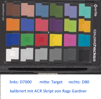 Dazu habe ich mit der D80 und der D7000 den ColorChecker Passport bei 45° Sonnenlicht klarer Himmel (D80: 5150K und D7000: 5550K) abfotografiert und anschließend nach dieser Anweisung eine Kalibrierung durchgeführt.