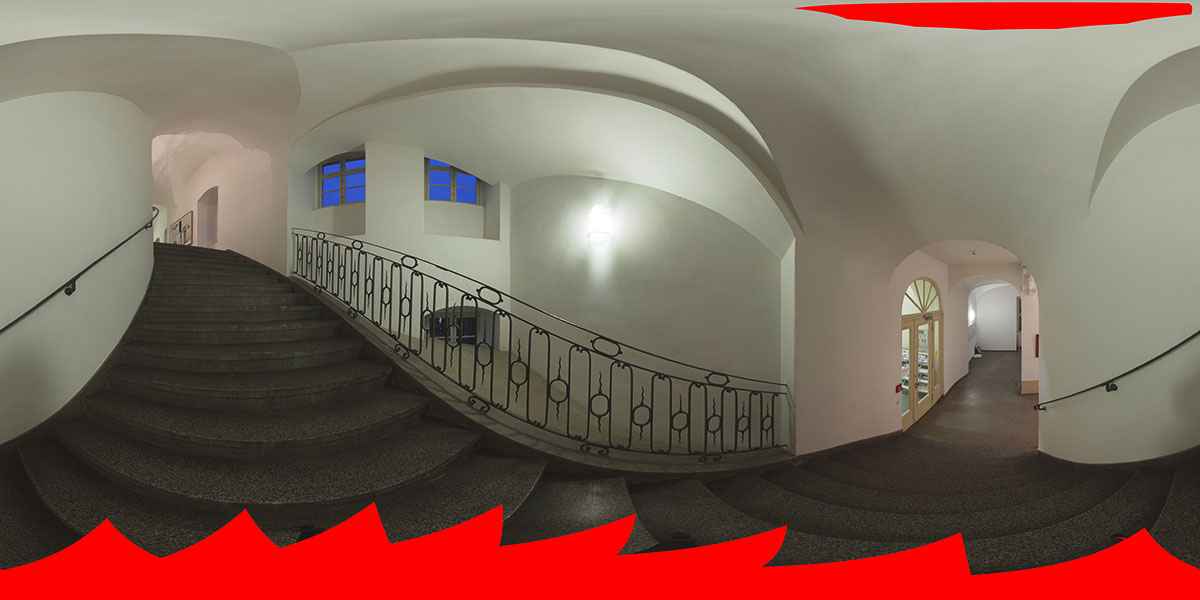 Bisher habe mich Hugin nicht dazu überreden können, mir ein Viewpoint-Bild so sauber einzuarbeiten, dass mir gefällt. Daher arbeite ich hier i.d.R. mit der unteren Würfelfläche und einem Viewpoint, das ich mit den gleichen Objektiveinstellungen wie die angrenzenden Bildern zu einer 90°x90° rektangulären Projektion transformiere (defish).