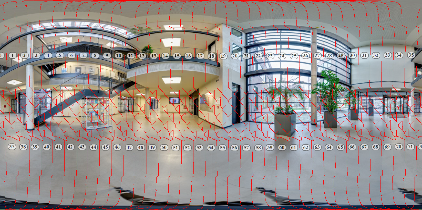 Ja, das geht mit PTGui. Du kannst ein Bild so maskieren, dass nur in der Mitte ein verwertbarer Streifen bleibt (beide Ränder links und rechts in Rot maskieren). Die Maskierung kann als Vorlage (soweit ich mich erinnere im png-Format) gespeichert werden, und dann sehr schnell auf alle anderen Bilder angewendet werden.Da ich nicht im Nodalpunkt aufgenommen habe, gibt das unschöne Fehler. Ich hätte gern einfach senkrechte Kanten, so wie im oberen/unteren Bildteil. Hat wer eine Ahnung, wie ich das hinkriege? Ich könnte natürlich mit Masken, die Kante selber definieren, es wäre aber schön, wenn das bei so vielen Bildern irgendwie automatisch ginge.