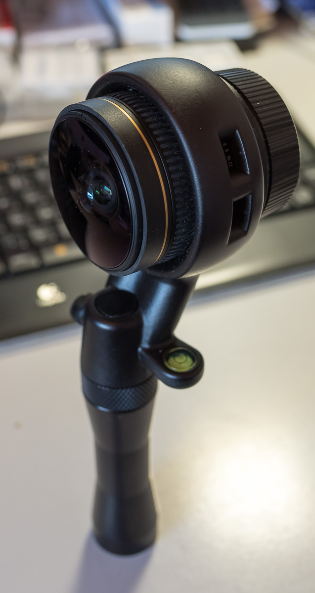 Ultralight Panohead for Nikkor 10.5mm f2.8 (+3.5°) mit 100mm Stativverlängerung von Tom Shot 360 gehört nicht mit zum Lieferumfang, kann aber für 100,- EUR dazu gekauft werden.