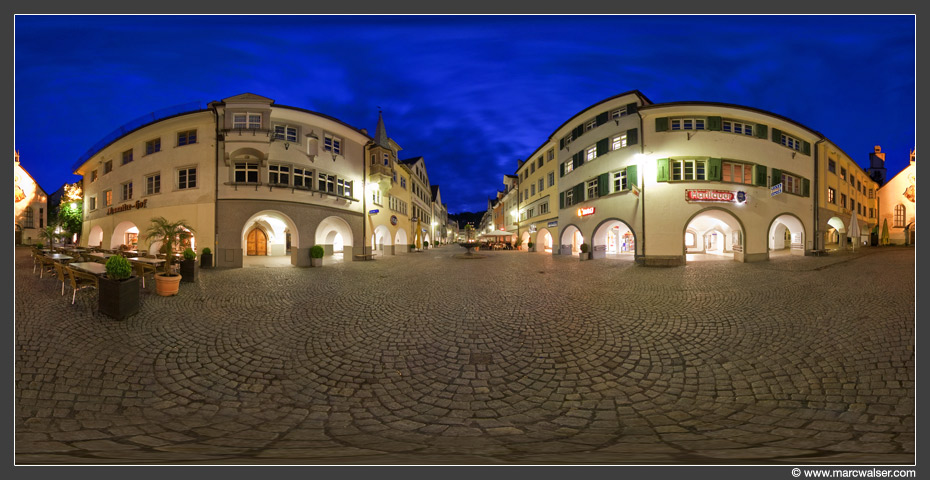 habe heute zur "blauen Stunde" ein Nachtpanorama im Format 360° x 180° aufgenommen. Und zwar war die Szenerie sozusagen mein "Heimatstädchen", nämlich die Stadt Feldkirch in Westösterreich. Letztes Jahr ist genau durch diese Straße Daniel Craig in Person von James Bond für den Film "Ein Quantum Trost" durchgefahren, nur so als Randbemerkung ;-)