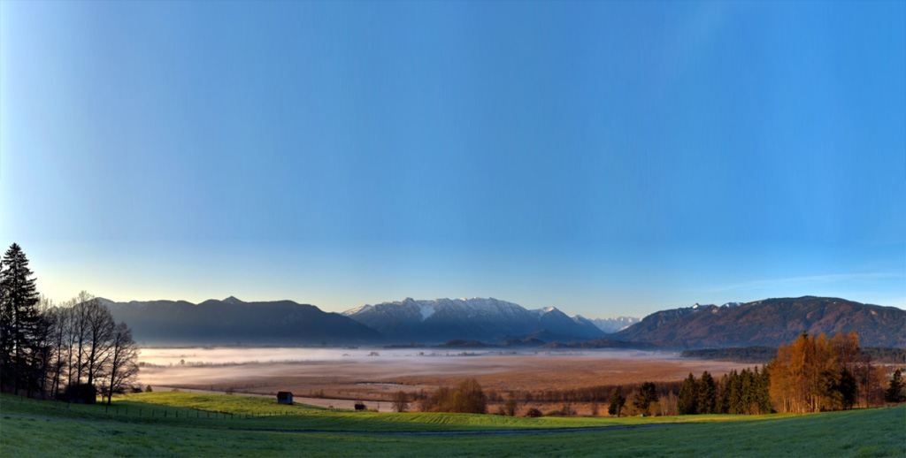 Habe vom unserem Verkehrsamt den Auftrag bekommen, ein Panorama an dieser Stelle anzufertigen, dass die Berge und das Murnauer Moos zeigt. Verwendet werden soll es für ein ca 2-3Meter langes, witterungsbeständiges Informationsschild an der Aufnahmestelle. Berge und wichtige Stellen im Bild werden noch mit den entsprechenden Namen versehen.