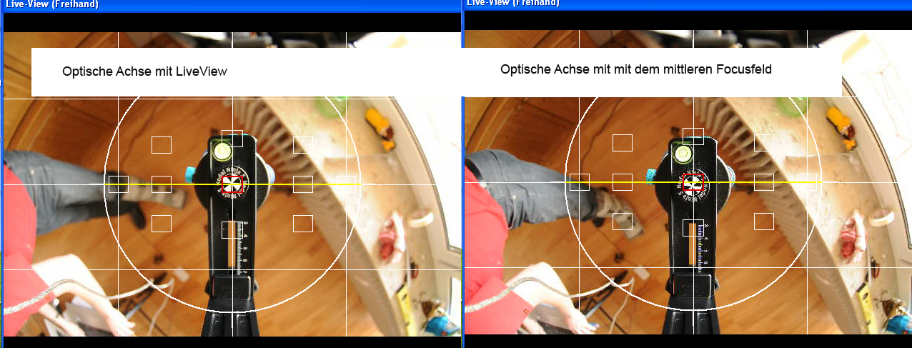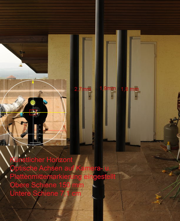 • Optische Achse nach Unten mit LiveView eingestellt, weicht zur optischen Achse Kamera/Objektiv ca. 5-6 mm ab, siehe Foto
