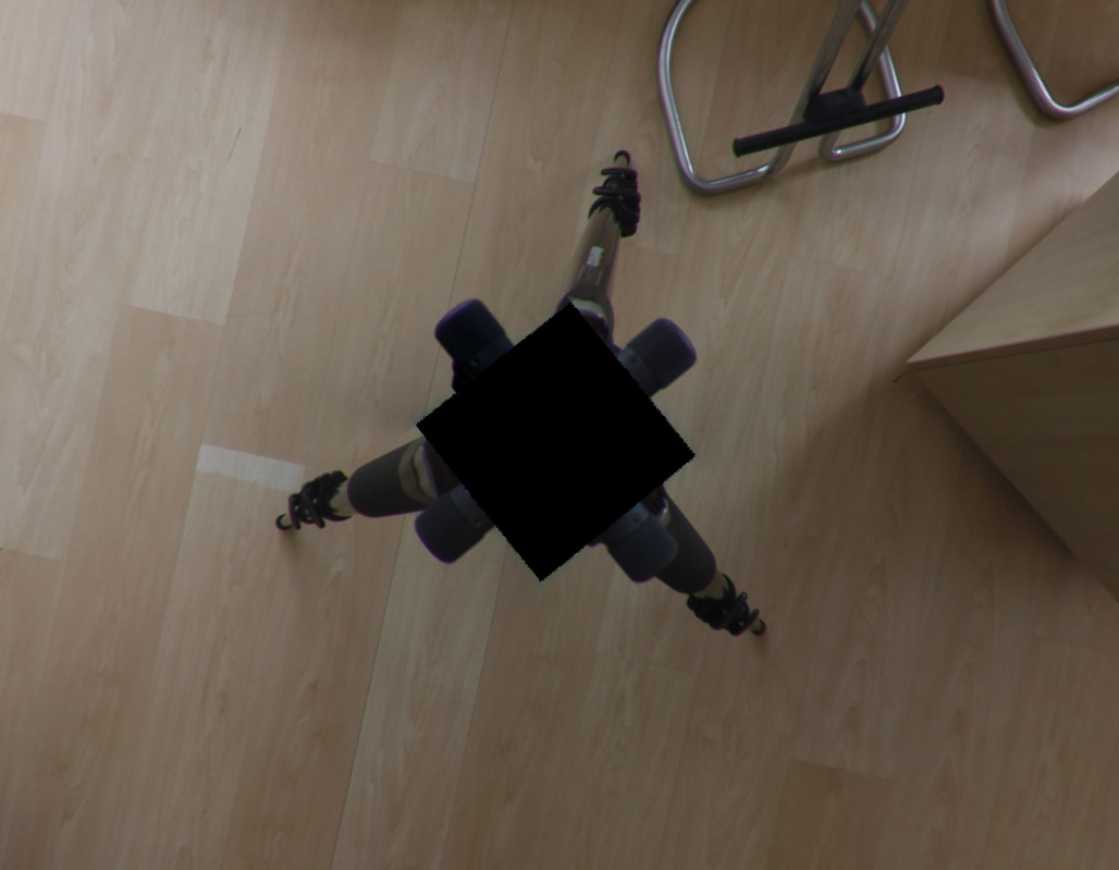 ich habe mal in PTGui die Cropkreise ganz aufgezogen und einen Screenshot aus dem Preview vom Fußabdruck gemacht. Siehe unten. Aufgrund der Ausrichtung um 8° nach oben fehlt unten natürlich ein kleiner Bereich, dafür kommt man aber ohne Zenithbild aus. Hätten wir den Panoramakopf gleich richtig montiert, so würde man unten auch nicht die Klemmschraube 4x sehen (wie es richtig geht, steht in der Anleitung, die ich selber geschrieben habe ;-).