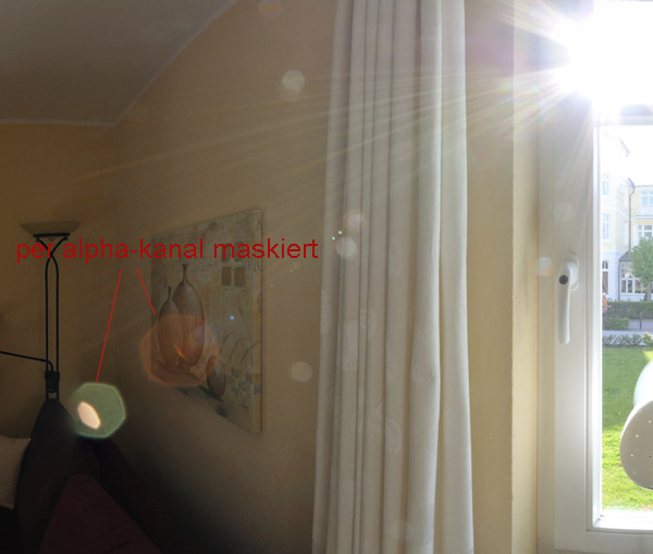 ich habe Blendenflecken per Alpha-Kanal in einem Bild maskiert, soweit alles ok.