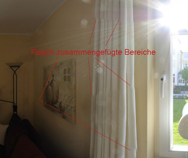 ich arbeite mit PTGui. Warum wird der Bereich um die Maskierung nicht verwendet? Normalerweise habe ich kein Problem damit zu retuschieren, aber Blendenflecken sind nicht so meine Lieblingsstellen dafür. Ich habe mal die Bilder vorher / nachher eingefügt. Wie man sieht kann man auch nicht sagen, der Bereich drum herum ist betroffen, denn hier sieht man, daß es eher ein keilförmiger Teil rechts und oben rechts von der Maskierung ist.