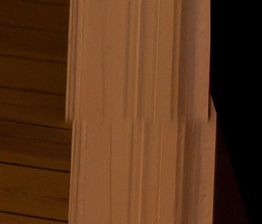 - Verbiegung der Parkettbretter: ich habe das jetzt für Objektivverzerrung gehalten? Wundert mich allerdings auch, dass die so extrem ausfällt. Wollte auch schon mal mit Adobe Lens Profiler zur Erstellung eines eigenen Linsenprofils und Korrektur in Lightroom versuchen, aber Richard meinte ja, dass dort vermutlich der Hase nicht im Pfeffer liegt.