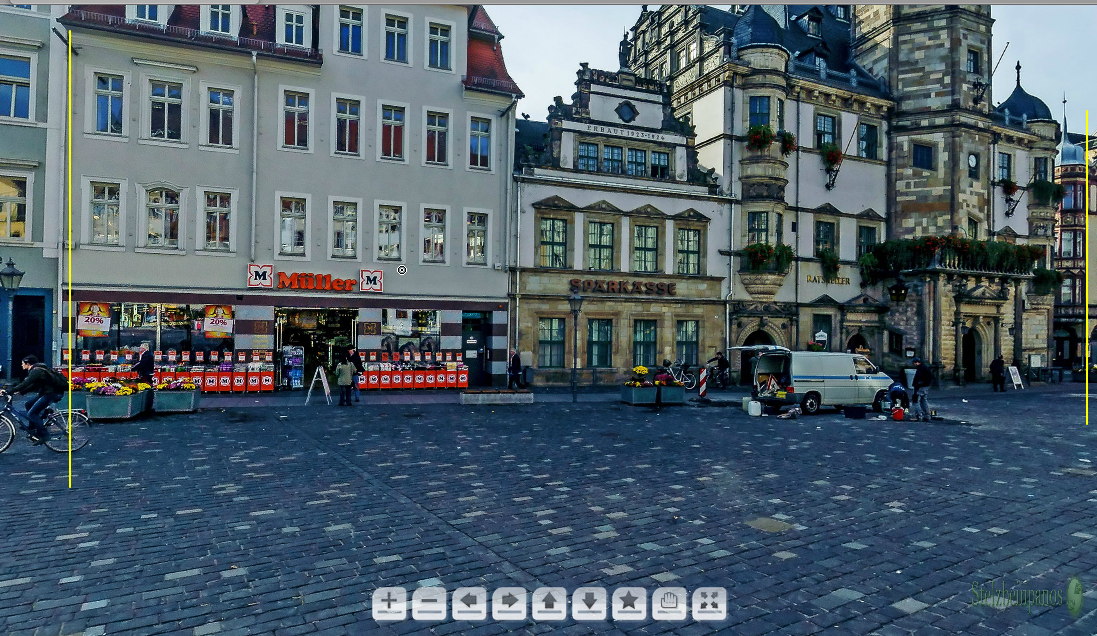das mit dem Taumeln ist ganz einfach. Wenn Du horitonal einstellst (pitch 0°) und Dich dann ein Mal rundherumdrehst, sind alle senkrechten Linien der Häuser immer senkrecht, am linken und am rechten Fensterrand. Wenn das nicht der fall ist, dann taumelt das Panorama. Der Horizont ist nicht schief, sondern gewellt im Equirect. Das liegt nicht am Marktplatz selber. Dass so viele Häuser so regelmäßig so schief stehen kommt NUR in taumelnden Panoramen vor, nie in Wirklichkeit. Da ist vielleicht Mal ein Haus schief und ein anderes in die andere Richtung.