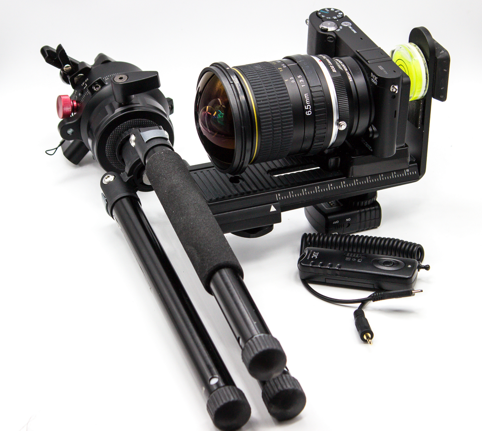 Mit nur 3 Aufnahmen Panos zu machen, finde ich extrem verführerisch! Aktuell habe ich für unterwegs ein 6,5mm an einer APS-C Systemkamera (s. Foto) und mache 6 Belichtungsreihen. Meine Ausrüstung ist schon minimalistisch (bis auf das schwere Objektiv) dachte ich, bis ich das 4mm mit dem Slant gesehen habe.