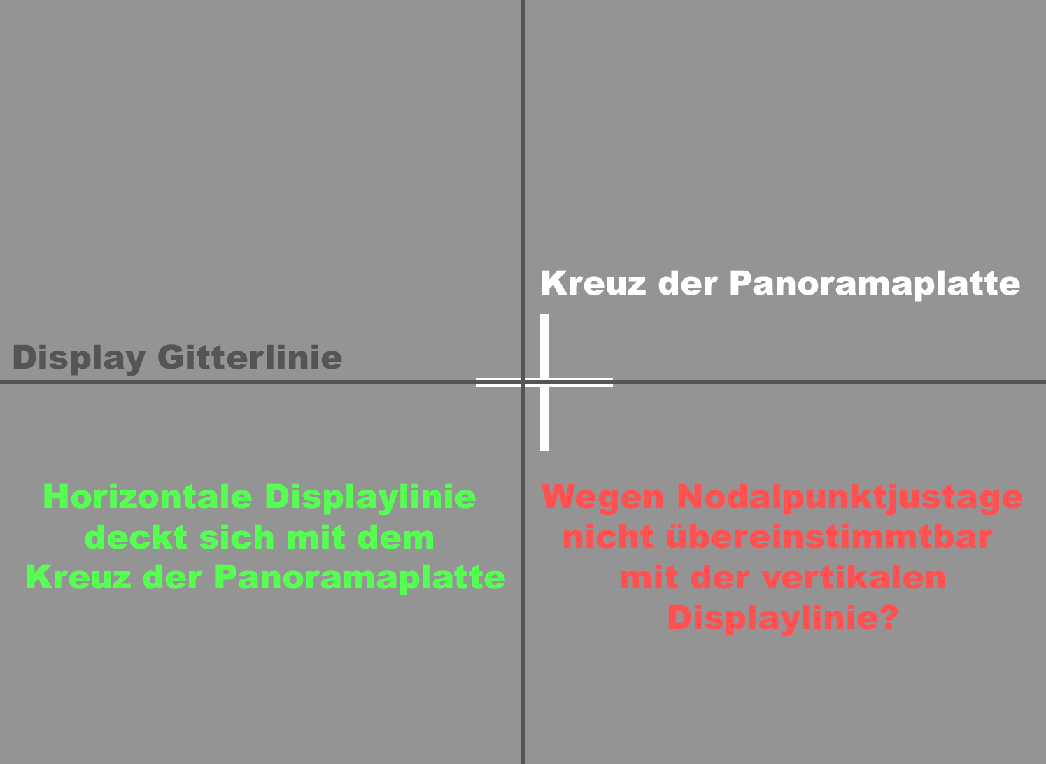 Ich habe den Nodalpunkt Pixelgenau auf 400% Zoom am Computer ermittelt. Wie ich es gemacht habe? Nun, eine sich fast überlappende Stelle in der Wohnung gesucht, bei mir war es eine herausstehende Wand und 1 Meter weiter hinten der obere, linke Bereich des Türrahmens. Die Kamera so positioniert dass man den Türrahmen rechts auf dem Display noch sehen konnte. Foto gemacht, und dann nach rechts geschwenkt. Erneut Foto gemacht. Den Türrahmen habe ich nun also einmal ganz rechts, und einmal ganz links.
