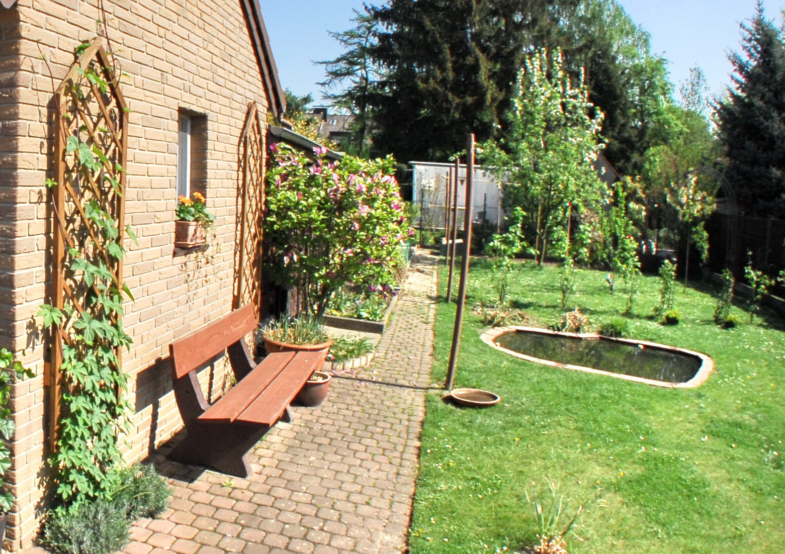 Das Haus ist im vorderen Bereich scharf. Die Schärfe nimmt weiter hinten und an den Bildrändern deutlich ab. In der Entfernung ist die Schärfentiefe überschritten, an den Rändern kann es durch CA und natürlichen Randabfall kommen.
