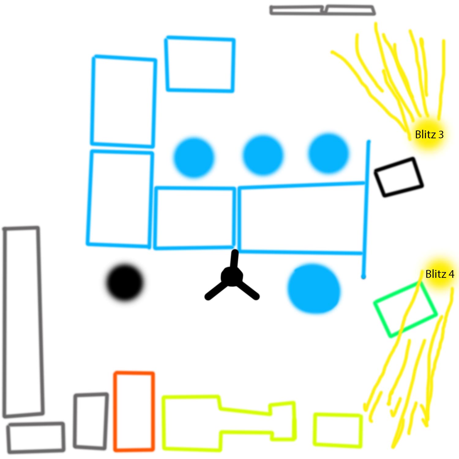 Ich habe dir mal eine Skizze gemacht. Blitz 3 und 4 waren jeweils ca. 75°nach oben und jeweils li. bzw die re. Wand/Decke gerichtet. Für das ganze Setup hatte ich ca. 10min inkl. der Knipserei. Ich hatte zwar 2 Tage vorher schon einmal alles "eingemessen" (Probepano) gemacht aber dann kam alles anders. 1. andere Seite 2. anderes Team und ich war nicht zusätzlich im Saal sondern musste für einen kranken Kollegen einspringen, so das ich das Pano "nebenbei" machen musste.