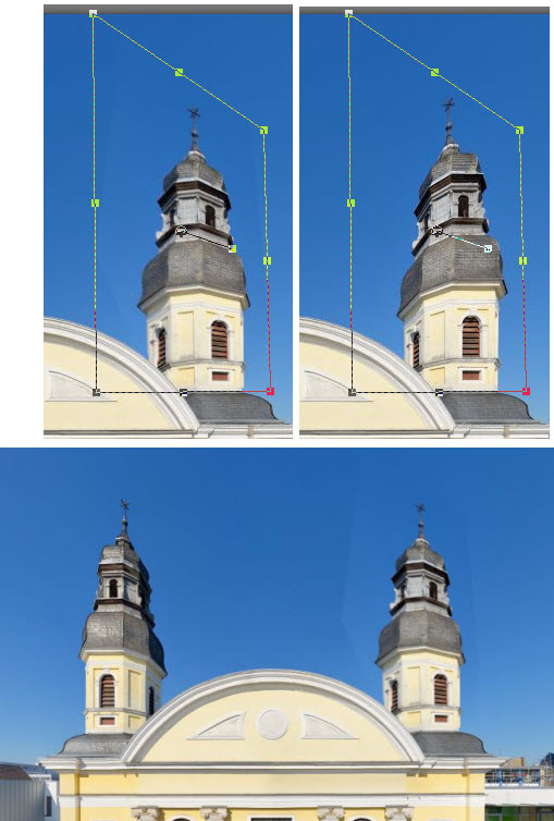 Zur Anschauung habe ich einen Ausschnitt Deines Bildes hergenommen und den rechten Zwiebelturm so gezerrt, wie ich ihn ertragen kann... ;-)