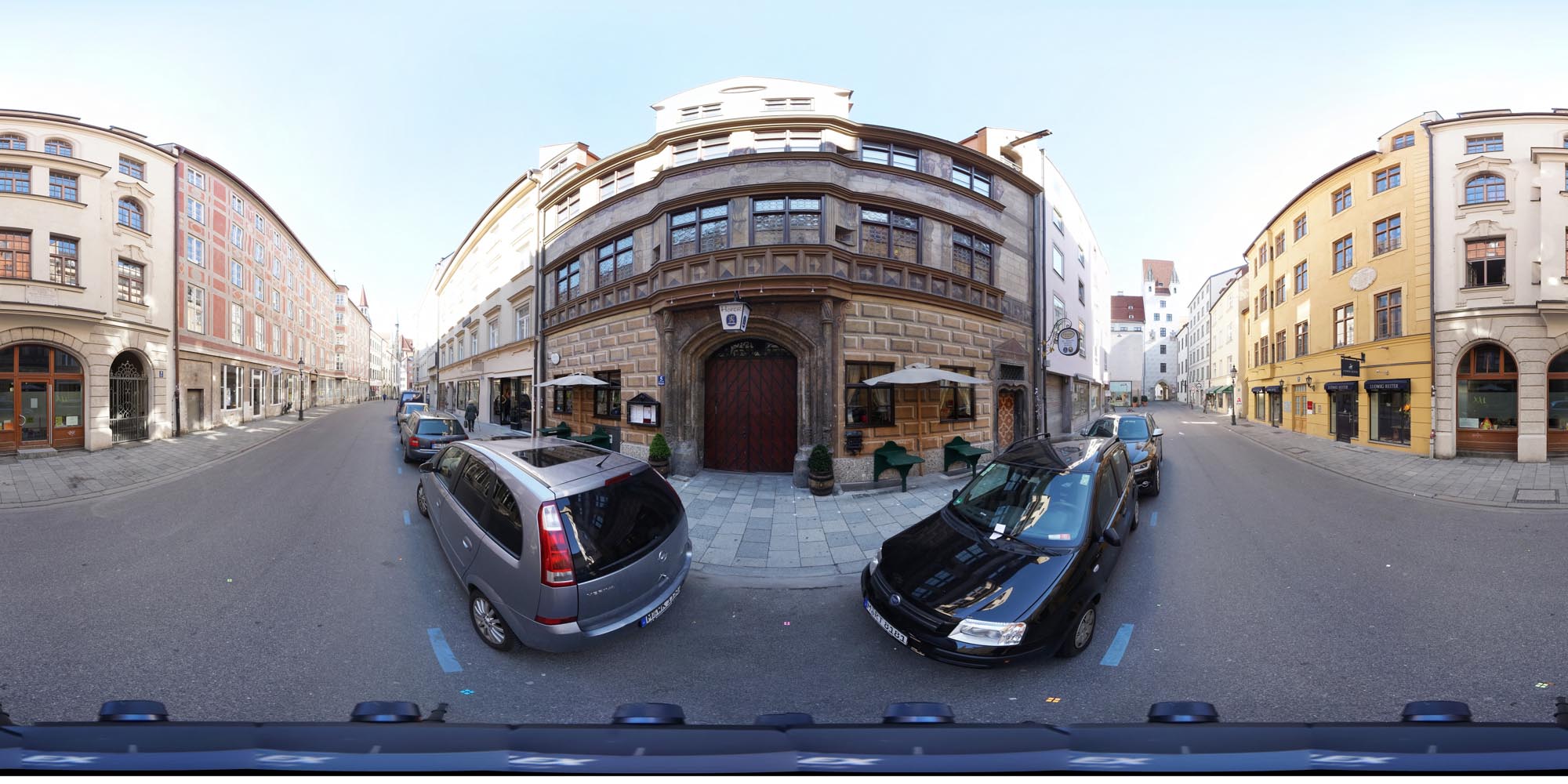 Das aus 2 Belichtungen gestitche HDR Pano wies immer noch ziemliches Banding im Himmel auf, darum habe ich jetzt doch nochmal die 3. Belichtungsreihe hinzugenommen, nochmal neues Tonemapping gemacht und neu gestitched. Danach noch meine Bodenmarkierungsblättchen und ein paar Sensordreckflecken weg gestempelt - voilà!Von HDR-Fusion in PTGui bin ich nicht so sehr überzeugt, und ich nutze es kaum. Der Workflow mit nur einer Belichtungsreihe geht einfacher und schneller, da entwickle ich die RAWs lieber vorher, und gebe entwickelte tiff in den Stitcher