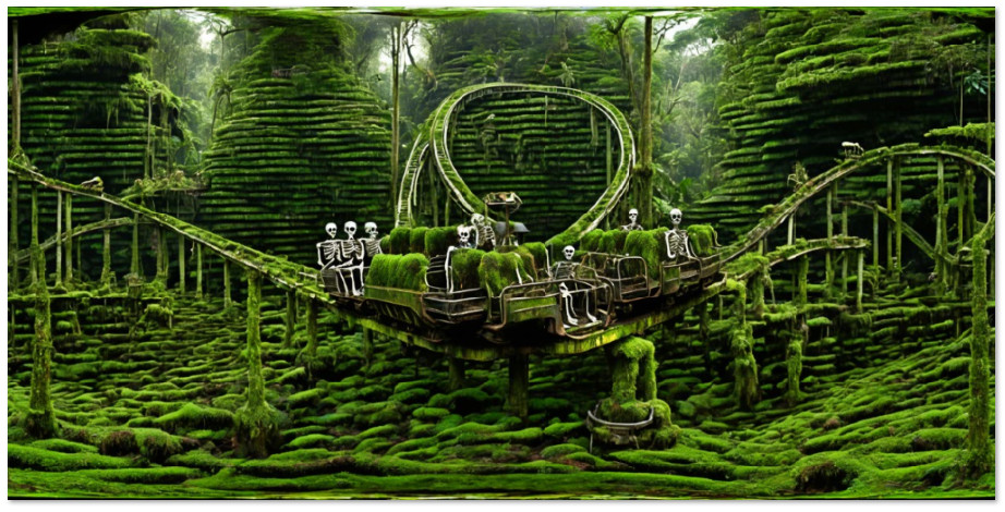 ((((deep green tropical steamy dense rainforest with trees everywhere)))), 360 degrees realistic equirectangular panorama photo, heavily corroded rotten rusted moss-covered rollercoaster, (((moss-covered human skeletons sitting in 3 carts))), looking straight to the front, 8k, high resolution, photo realistic, rich colors, <lora:Cloudify-SDXL:1.5> <lora:View360:0.7>