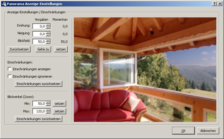Was Pano2VR betrifft, diese hat in der "Viewing Parameters" (Anzeige-Einstellungen) nur die Werte Max. und Min, d.h. man kann den Startwert nicht mit dem Min.-Wert ersetzen und nach der Optimierung wieder zuruecksetzen.
