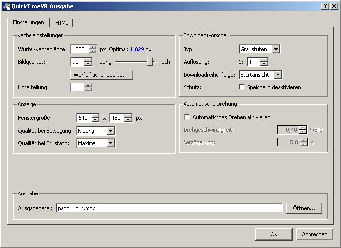 Unter Anzeige-Einstellungen oben bei Blickfeld Wert eingeben, mit setzen bestätigen, OK, QuicktimeVR Ausgabe, bei Würfelkantenlänge wird der Wert Optimal angezeigt.