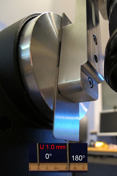 Im Seitwärtsschwenk kannst Du das noch ein Mal überprüfen. Wenn es nicht passt, dann noch Mal mit der Linealmethode prüfen, evtl. waren die Achsen etwas schief zueinander, oder Spiel bei der Justage. Auch da kannst Du die Nadel z.B. genau auf die Linealkante zeigen lassen, dann erkennst Du auch einen Parallaxversatz in die andere Richtung. Wenn Du jetzt 3 Bilder je 90° machst und die Spitzen nicht wegwandern, hast Du Deinen Adapter optimal justiert