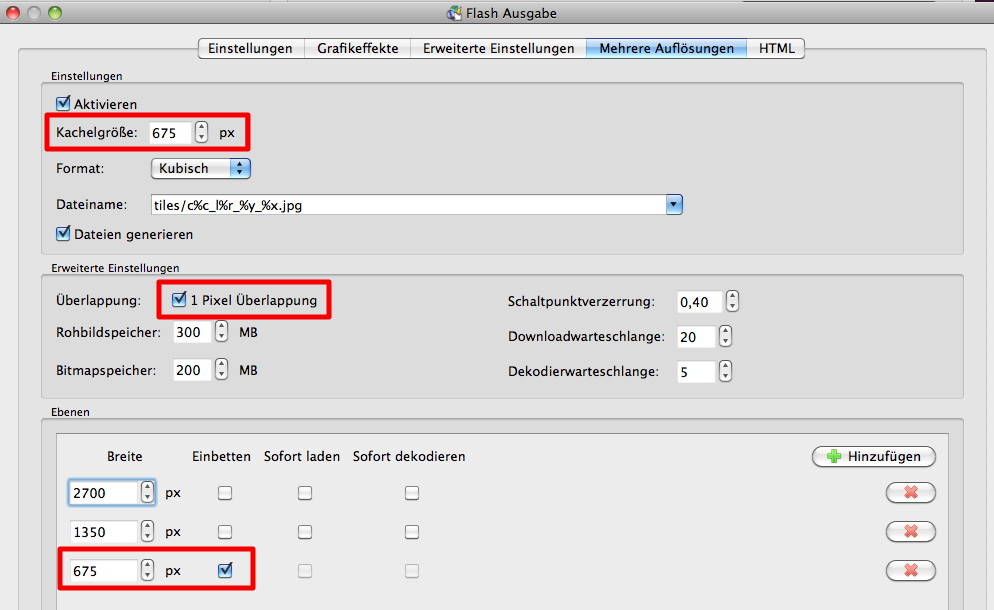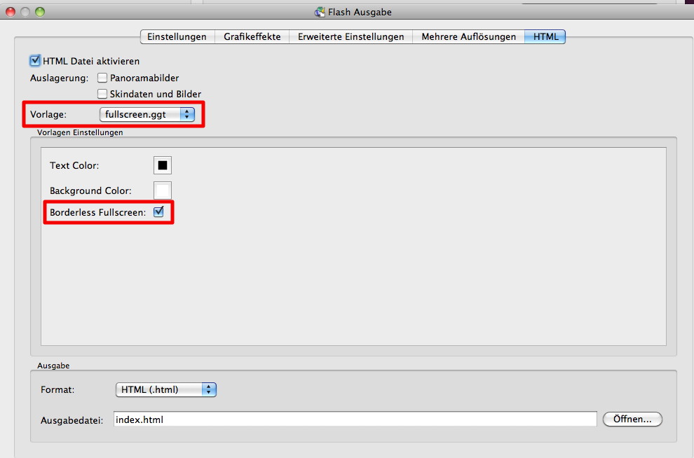 Für die Darstellung wähle ich folgende Optionen für die Flashdatei: