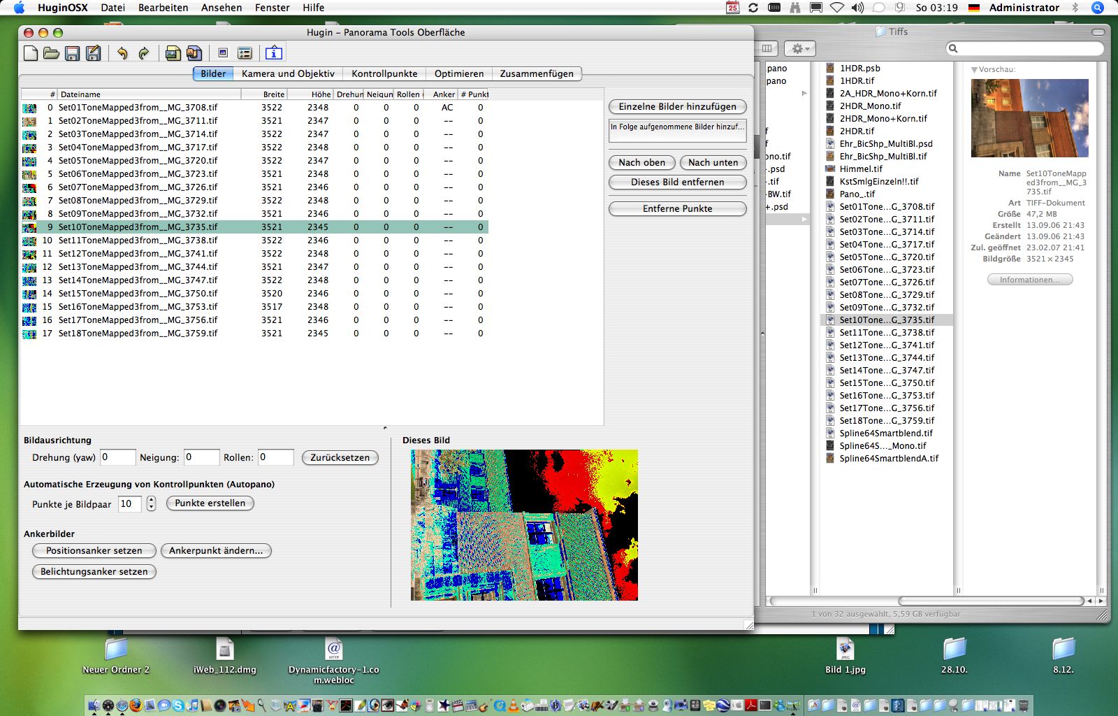 Klaus Hallo Mike! o.k.: ich hatte das mit der Demo mit PTMac verwechselt - ich hab im Moment viel zu tun, sodaß ich mich nur in der Nacht mit Panos beschäftigen kann. Was sollte ich an einer Software besser kennenlernen um sie zu bewegen, meine 16bit-TIFFs anzunehmen? Die werden von allen anderen Programmen angenommen, mit denen ich arbeite. Einschließlich APP. Problemlos und korrekt. Gut - nun hab ich sie in 8-bit gewandelt und HUGIN nimm sie ja nun auch. Da ich aber nicht gerne nachts gegen 4Uhr reihenweise Kontrollpunkte manuell setzen möchte hab ich die Automatik versucht, die auf Autopano zugreifen soll. Tut sie nicht. Ansonsten gibt es keine automatische Kontrollpunkt-Zuweisung - zumindest hab ich keine gefunden. Ich werde gleich mal zwei nebeneinanderliegende Bilder als Originaldateien auf meinen Webspace legen - da könnt Ihr sie (Björn und Du) ja mal runterladen. Das sind bei den beiden 16bit-TIFFs ca. 90MB. sie stehen unter http://www.klausesser.de/Set05ToneMapped3from__MG_3717.tif http://www.klausesser.de/Set05ToneMapped3from__MG_3720.tif 8bit ist witzlos - das funktioniert ja.