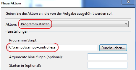 3. Diese Zeile rein kopieren: "/min start C:\xampp\xampp-control.exe"