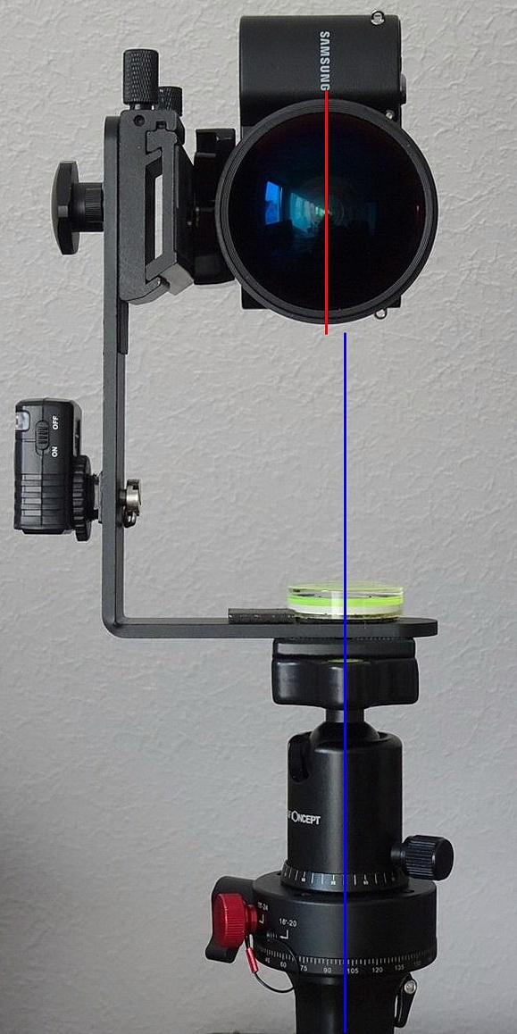 Die Schwenkachse verläuft bei seinem Aufbau durch den Rotator, durch die Panoplatte des Kugelkopf und auch durch die wie auch immer schräg stehende Säule, ich denke darin sind wir uns einig oder?