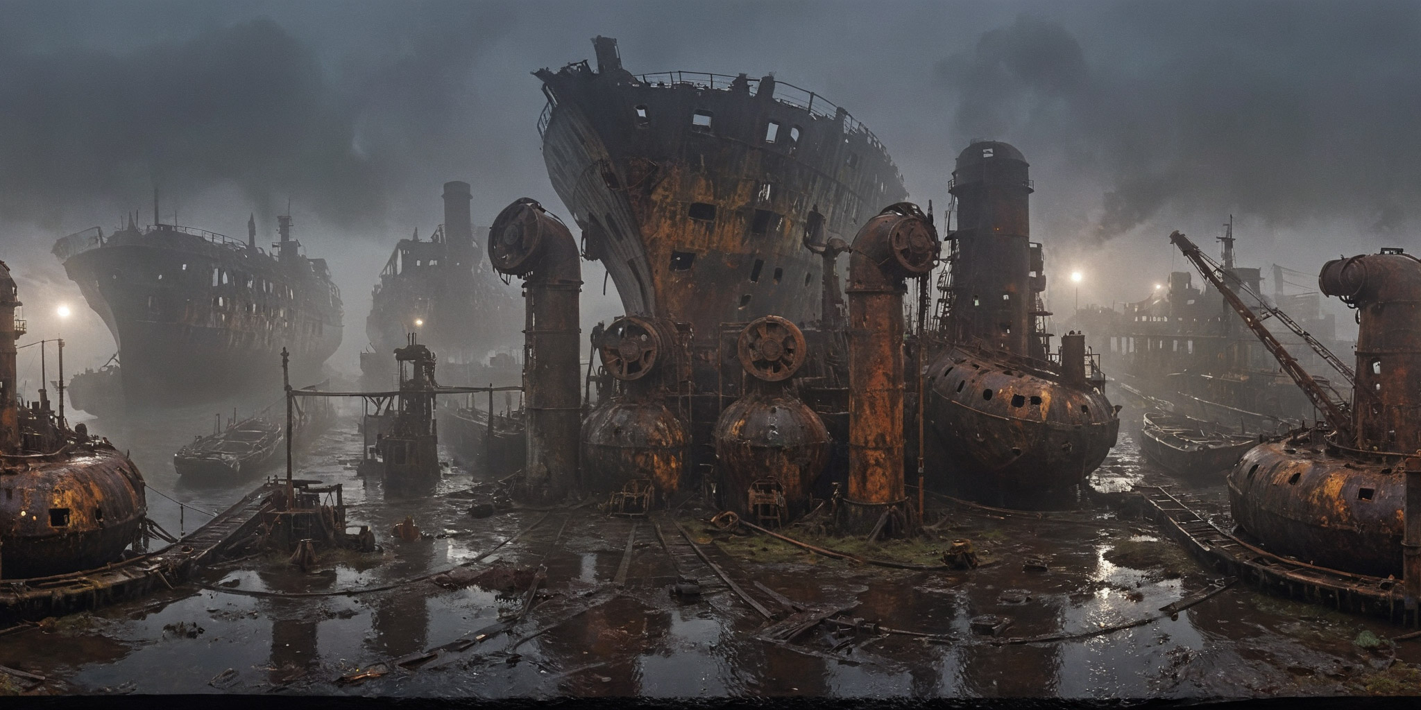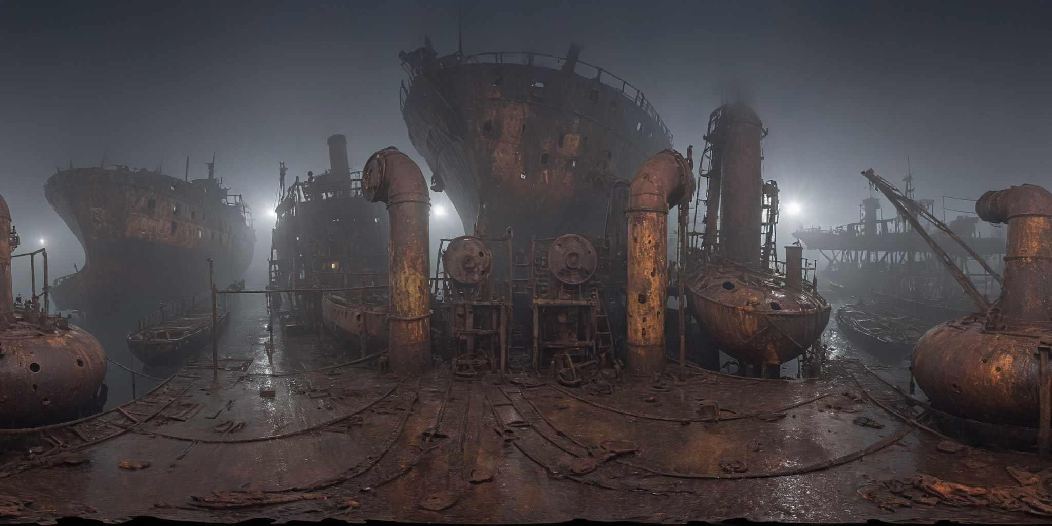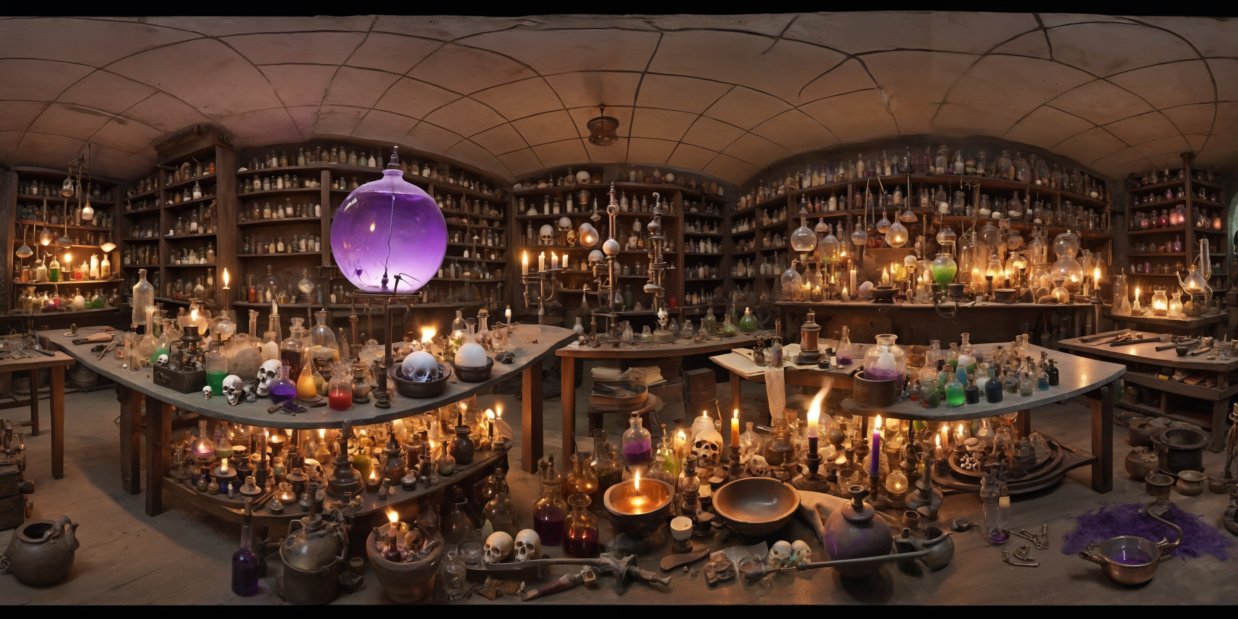 dark workshop with many tools, shelves, materials, many tools hanging on the wall and on the ceiling, iron working, welding, light reflections, artist at work, 360 degrees realistic equirectangular panoramic photo, 8k, high resolution, photo realistic, rich colors ,highly detailed,, <lora:Into_Darkness:0.7> <lora:Cloudify-SDXL:1>
