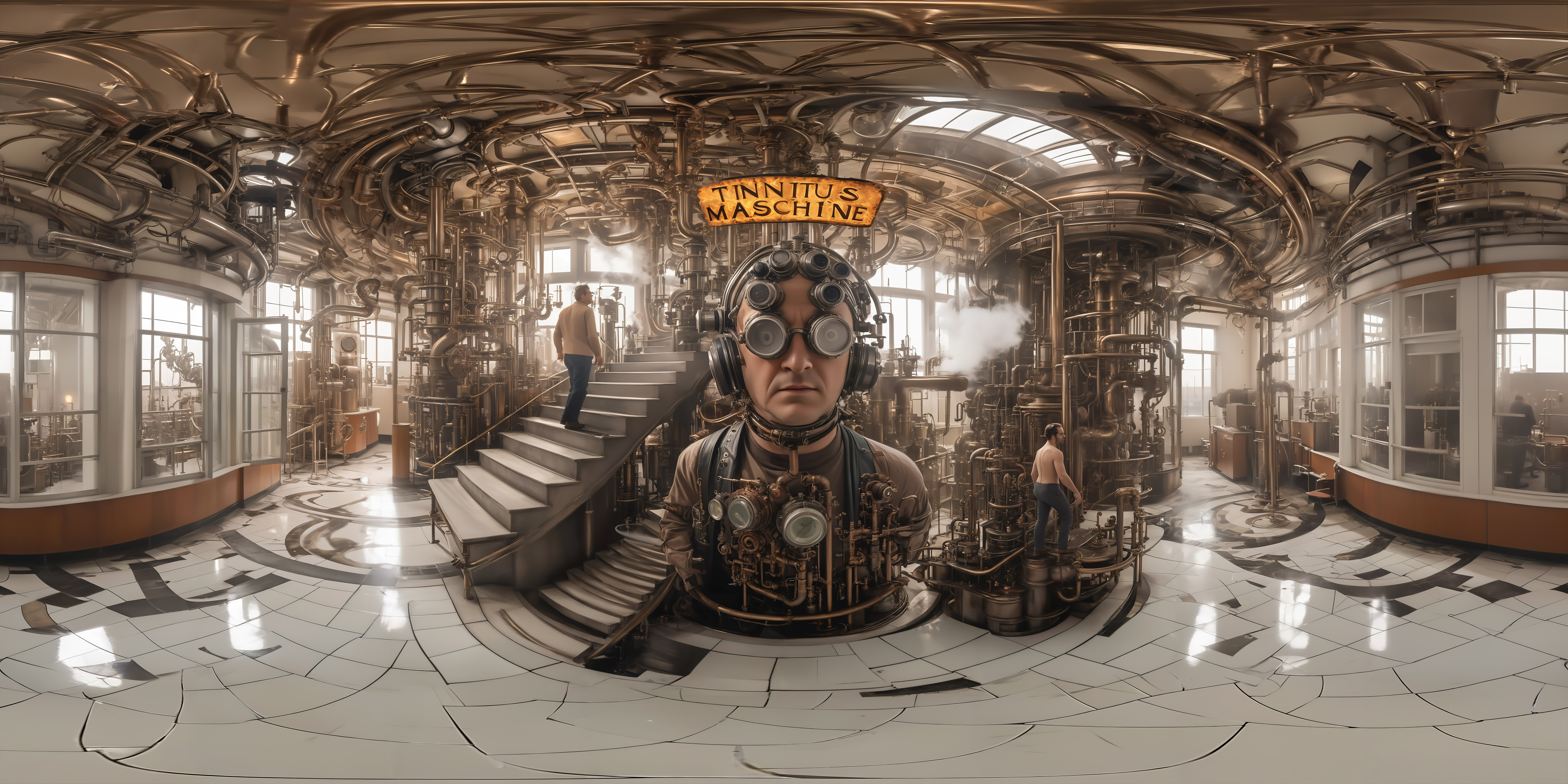 many big shiny metal machines lying all over the tables, books, papers with instructions and (((engine-parts laying on the tables))), boxes, tubes, empty floor, 360 degree panorama, equirectangular, one door, <lora:View360:0.7>