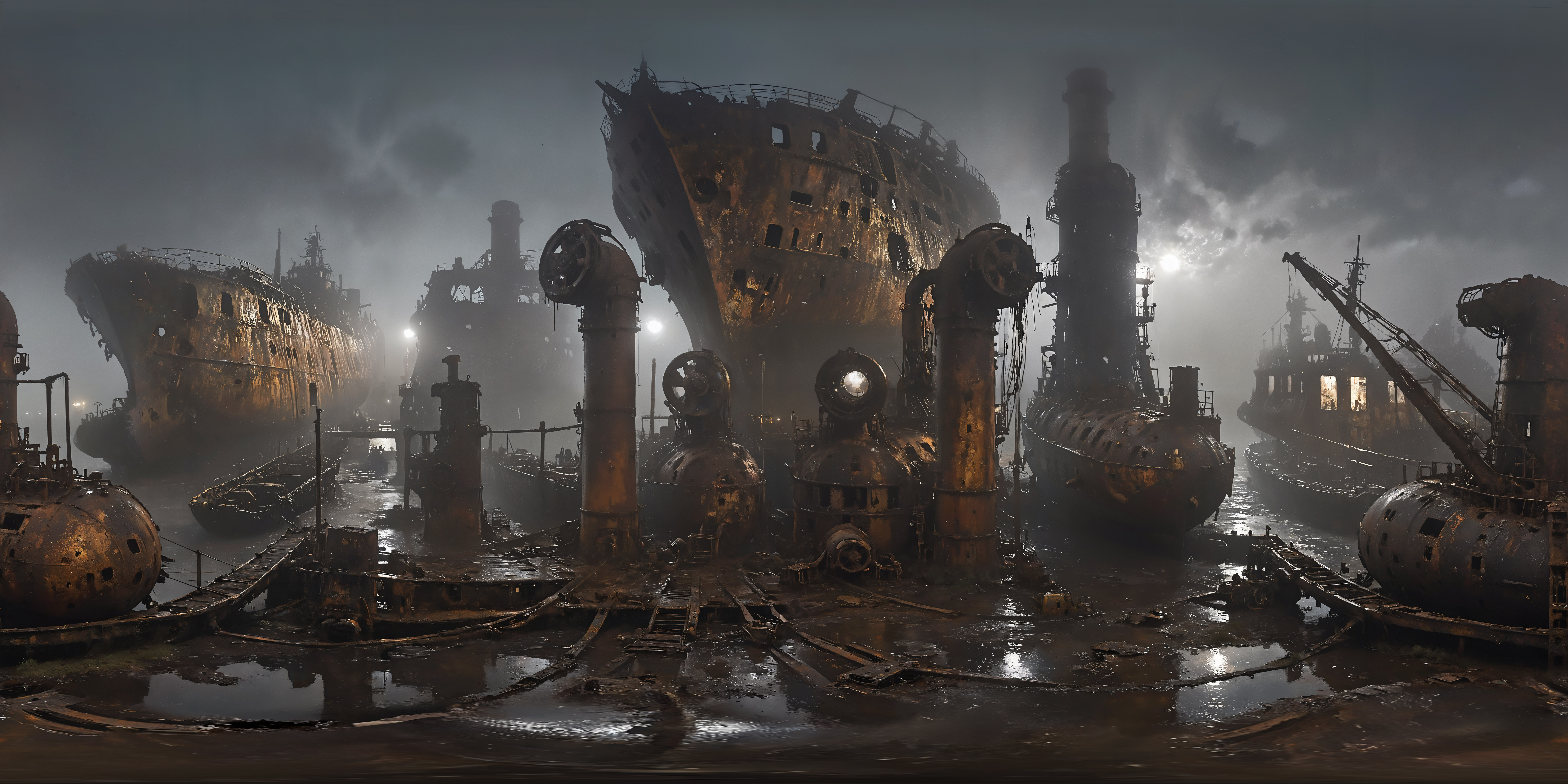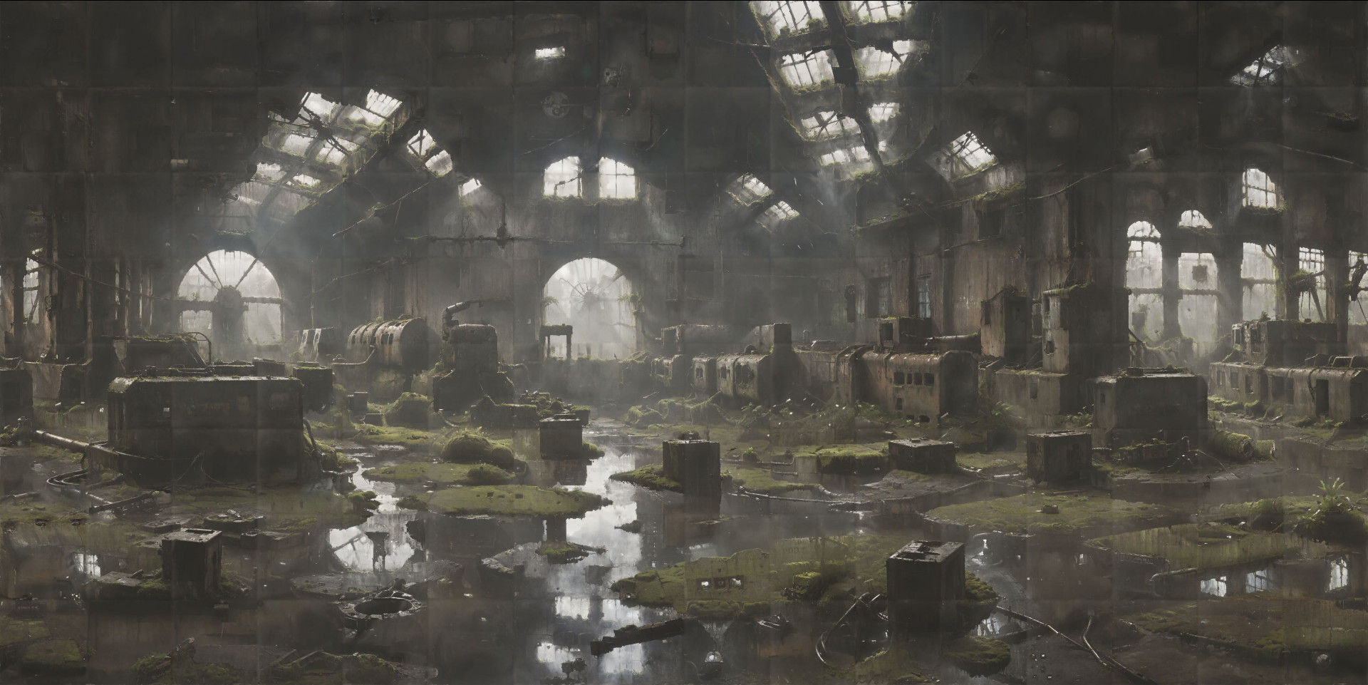 A dark and ancient hall with various huge, old and rusty machines, cables lying around, distribution boxes on the walls, broken window panes, moss and other vegetation hanging from the partly collapsed ceiling and walls, hazy and contrasting air, tons, crumbling boxes, broken pipes, fans on the ceiling, broken floor tiles, plants sprouting from the joints, oppressive, eerie, dilapidated, old, puddles of water on the floor, <lora:Into_Darkness:0.7> <lora:Cloudify-SDXL:1>
