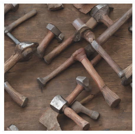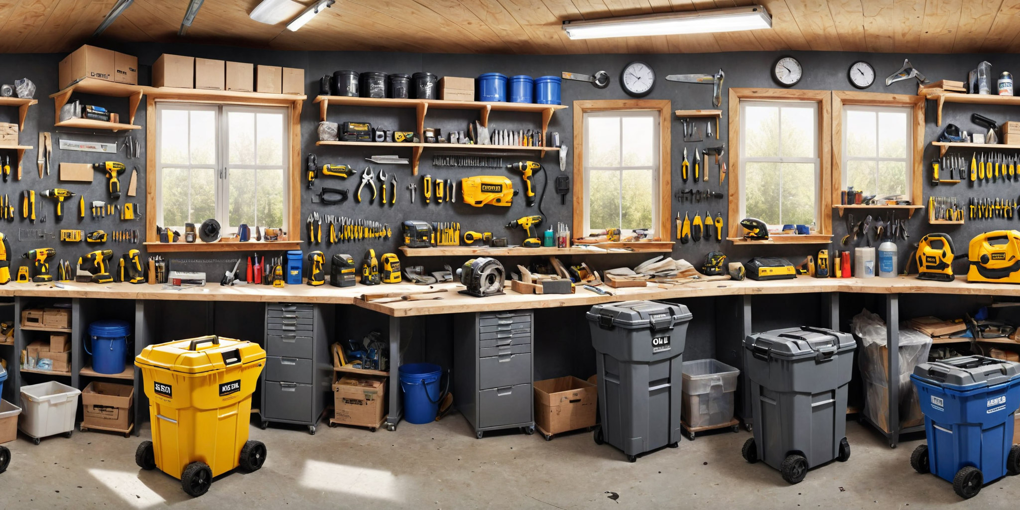 Werkzeuglager, Hämmer, Zange, Schraubstock, Schleifmaschine, Presse, Kreissäge, Bohrmaschine, Feilen, Wasserwaage, Kanister, Kofferradio, Putzlappen, Oberfräse, Gehrungslade, Aufbewahrungsboxen für Schrauben, Nägel, Öl-Eimer, Papierkorb, Mülleimer, Handsäge