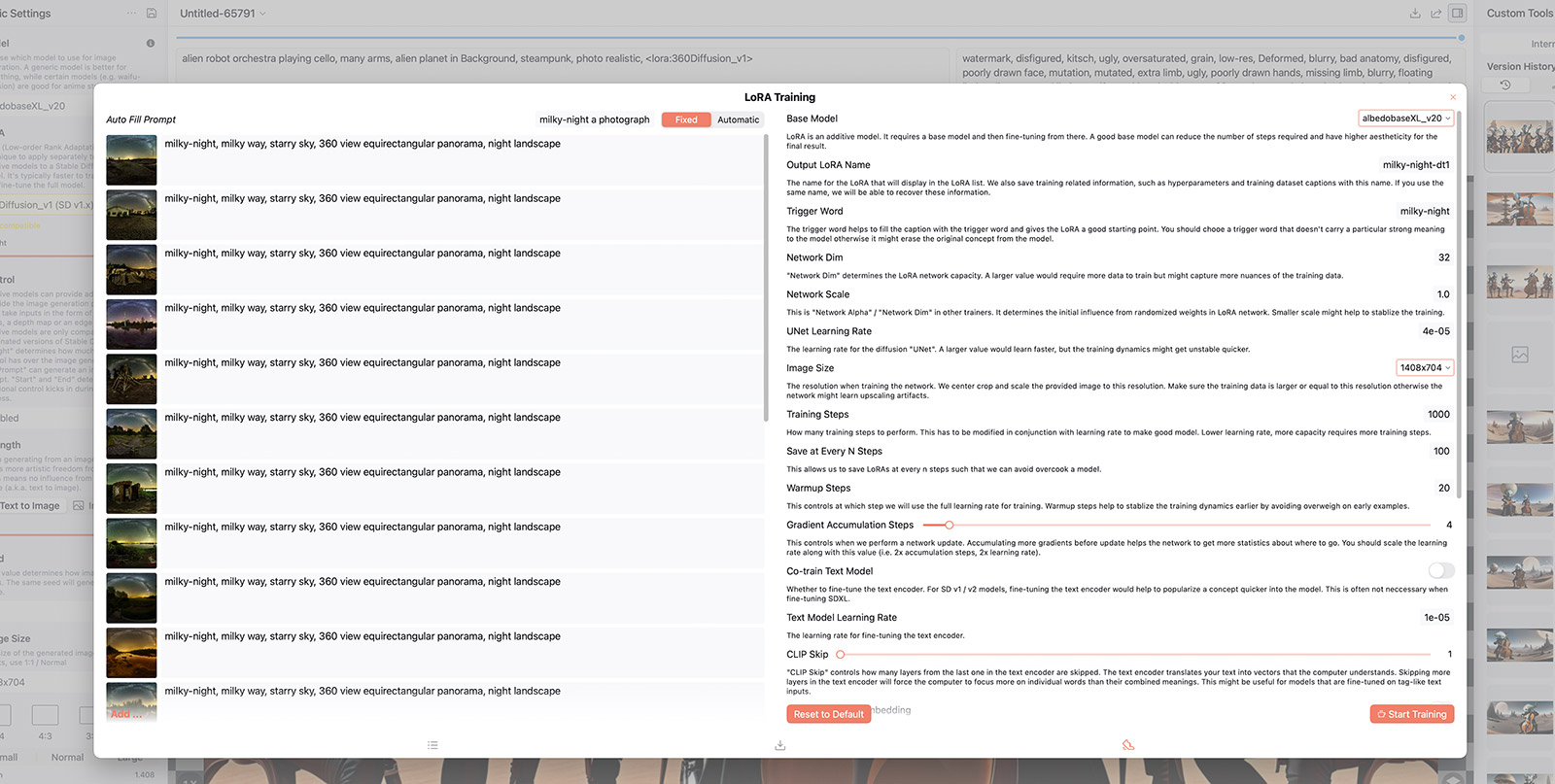 Steps: 10, Sampler: DPM++ 2M Karras, CFG scale: 5, Seed: 2991772477, Size: 16384x8192, Model hash: 3d1ff0f061, Model: MOHAWK_v20, Denoising strength: 0.4, Tiling: True, Ultimate SD upscale upscaler: 4x-UltraSharp, Ultimate SD upscale tile_width: 1024, Ultimate SD upscale tile_height: 1024, Ultimate SD upscale mask_blur: 16, Ultimate SD upscale padding: 64, Lora hashes: "Into_Darkness: a19db05b8920, Cloudify-SDXL: af954341de9b", Version: v1.7.0