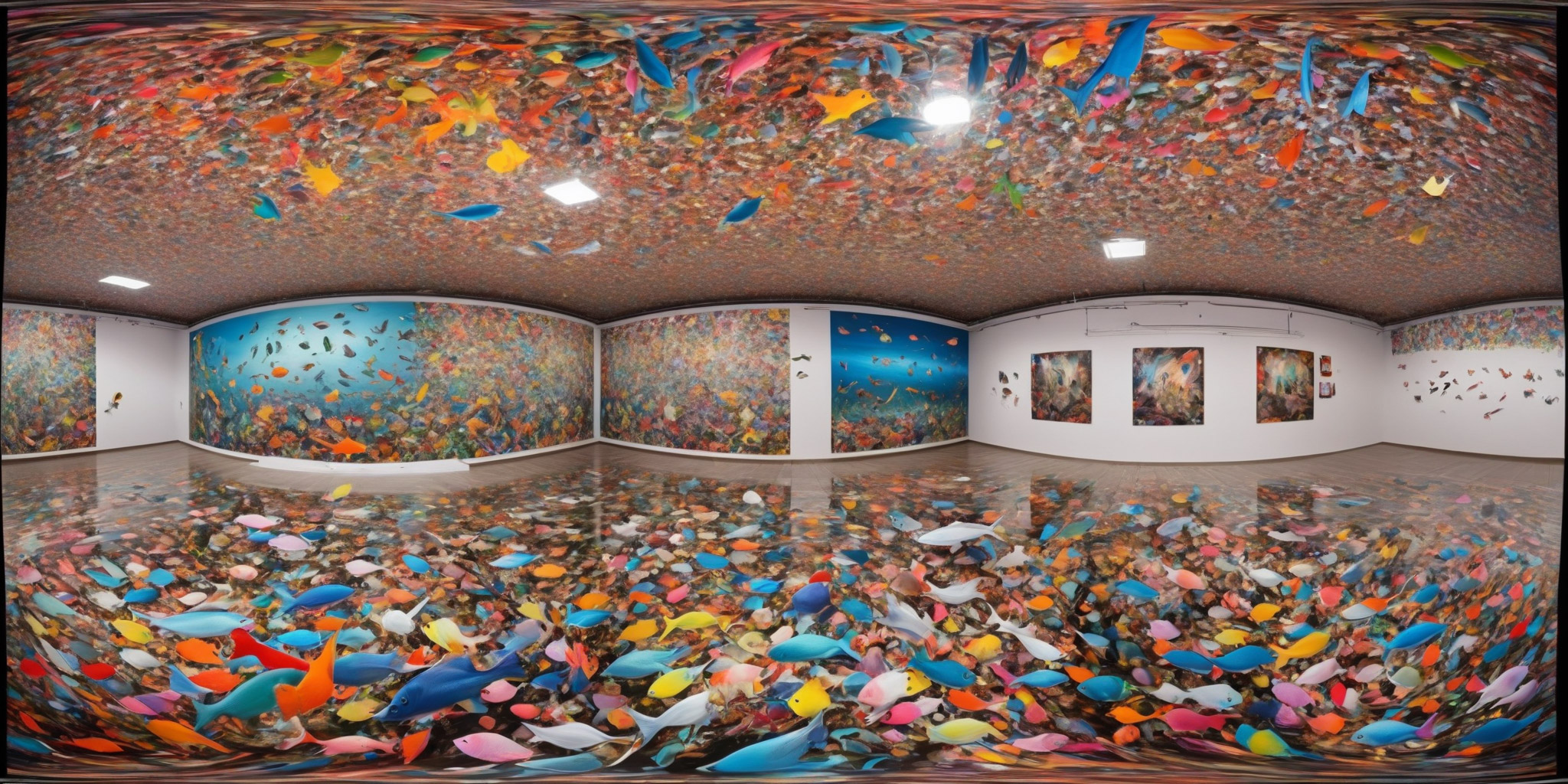 room with exhibition of psychedelic surreal modern art colourful painting, fishes are swimming at the ceiling and the floor(((((many images on the walls))))), ultrawhite spotlights, 360 degrees realistic equirectangular panorama photo, 8k, high resolution, photo realistic, ultrasharp, rich colors,