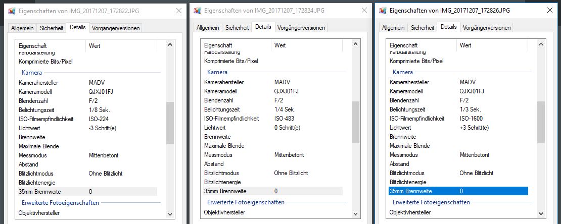 Ich habe bracketing +-1 Blende eingestellt. Leider haben alle 3 Bilder die gleiche Belichtungszeit von 1/2 sek.