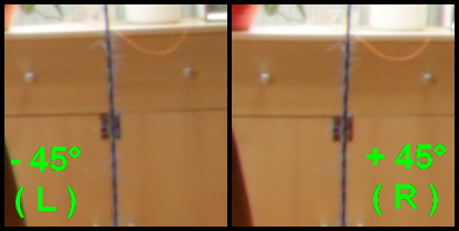 Bei Blende 22 waren Faden und Türspalt noch einigermaßen zu erahnen. Weil sich aus der Perspektive der Türspalt hinter dem Faden verstecken kann bzw. hinter diesem ungesehen hin- u her wandern kann hab ich in gleichem Abstand zum Spalt links u. rechts noch einen Streifen Isolierband angebracht. So haben die Schwenks meiner o.g. Einstellung dann ausgesehen: