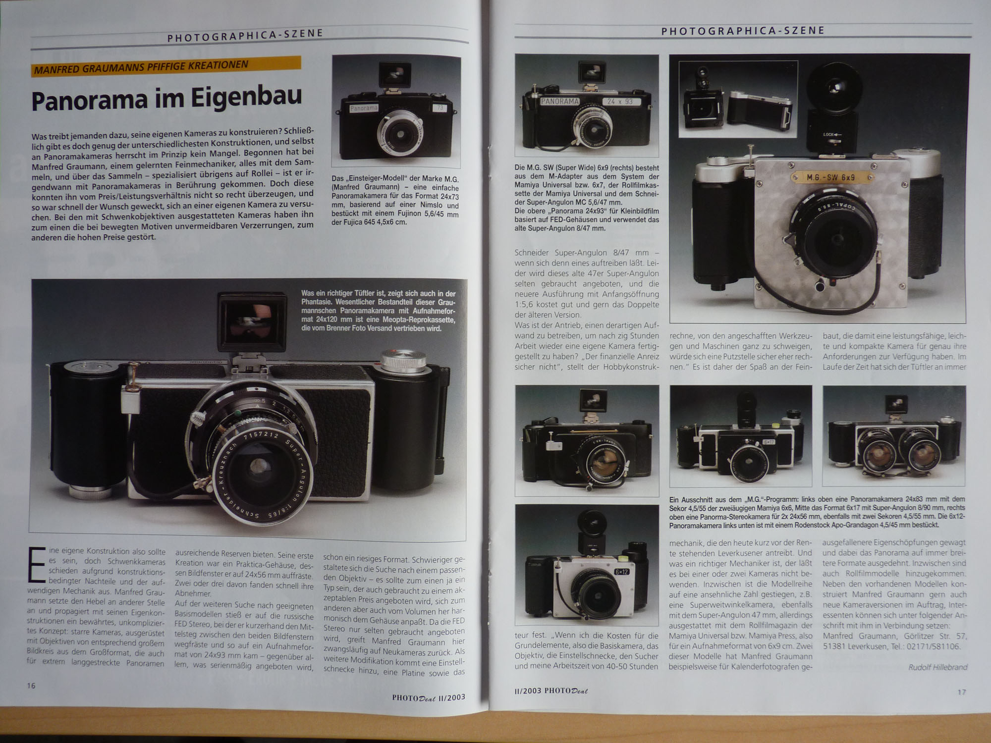 Ich biete hier eine 6x12 Panoramakamera im Mittelformat an. Originalkameras für dieses Format sind sehr teuer. Ich habe diese Kamera bei jemandem gekauft, der über die Jahre Kameras in Eigenbau hergestelt hat. Dieser Herr lebt leider nicht mehr. Ein Bericht über ihn aus der Zeitschrift "Photo Deal" aus dem Jahre 2003 habe ich angefügt, ebenso einige Fotos von der Kamera. Die Herstellung der Kameras dieses Herrn, der auf vielen Fotobörsen bekannt war, erfolgte größtenteils aus neuwertigen, gebrauchten Fotokomponenten. Teilweise auch Neuteile. Damit ist so eine Kamera auch für den ambitionierten Anwender relativ preiswert zu bekommen. Die Basis dieser 6x12-Kamera bildet ein Mamiya-Universal-Magazin. Die Optik ist ein Rodenstock Apo-Grandagon 4,5/45mm 110°. Der Verschluss ist ein Zentralverschluss Copal 0 von 1 - 1/500 und B. Sonstiges: Aufstecksucher, Filmtransport über Knopf und Filmfenster.