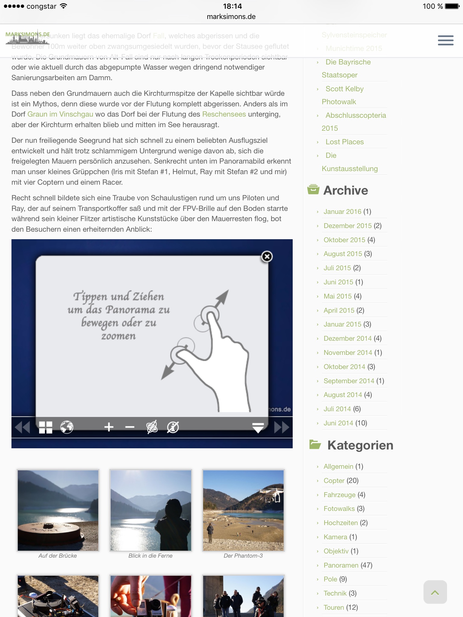Am Smartphone schaut's leider nicht so gut aus, wenn man auf das > tippt poppt ein Fenster auf, das sich nach kurzer Ladezeit mit einem little planet füllt, der nach weiterer kurzer Verzägerung in das Pano reinzoomt. Sobald die Endposition dieser Zoomfahrt erreicht ist wird das Bild schwarz :-(