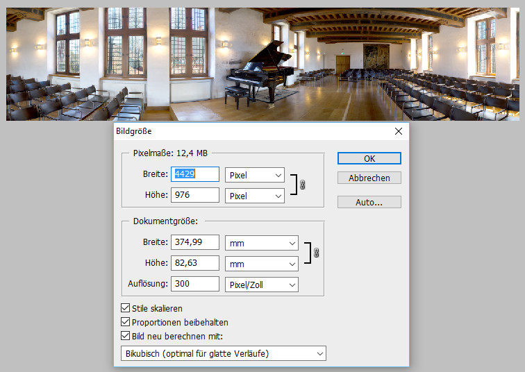 Nur ist das damit nicht getan. Im Gegenteil, damit habe ich noch nichts erreicht. Meinen gewünschten Bildausschnitt aus dem Panorama mit exakt den geforderten Abmessungen kann ich so nicht erzeugen.