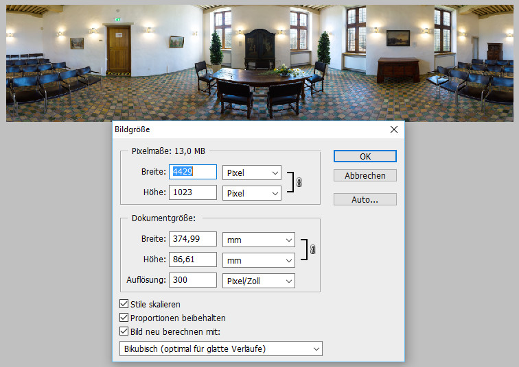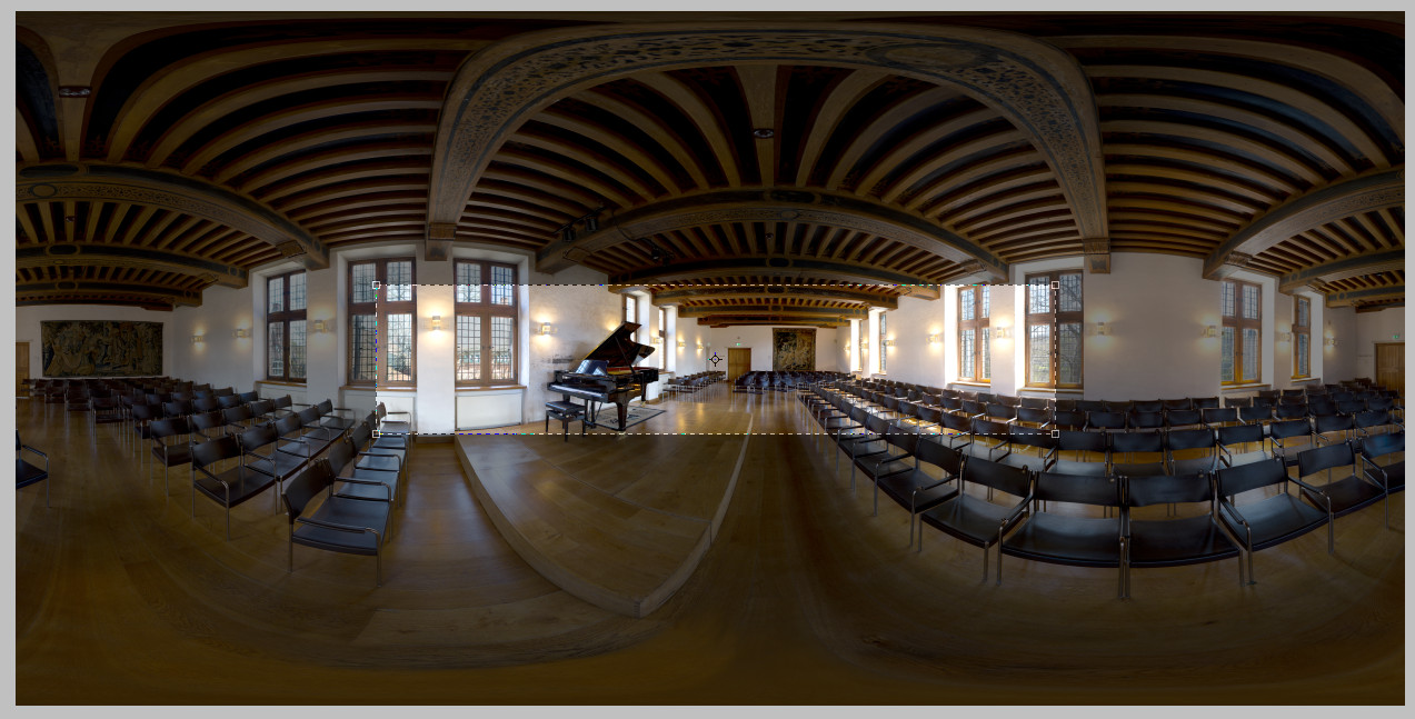 Nachdem ich die erforderlichen Bildmaße bekommen habe, habe ich ein weißes Dummy-Bild als halbtransparente Ebene über das equirectangulare Original-Panorama gelegt, dieses proportional verkleinert und einen passenden Bildausschnitt durch Verschieben des Dummy-Bildes festgelegt. Durch Auswählen, Umkehr der Auswahl und Löschen konnte ich so einen Ausschnitt aus dem Original-Panorama erzeugen.