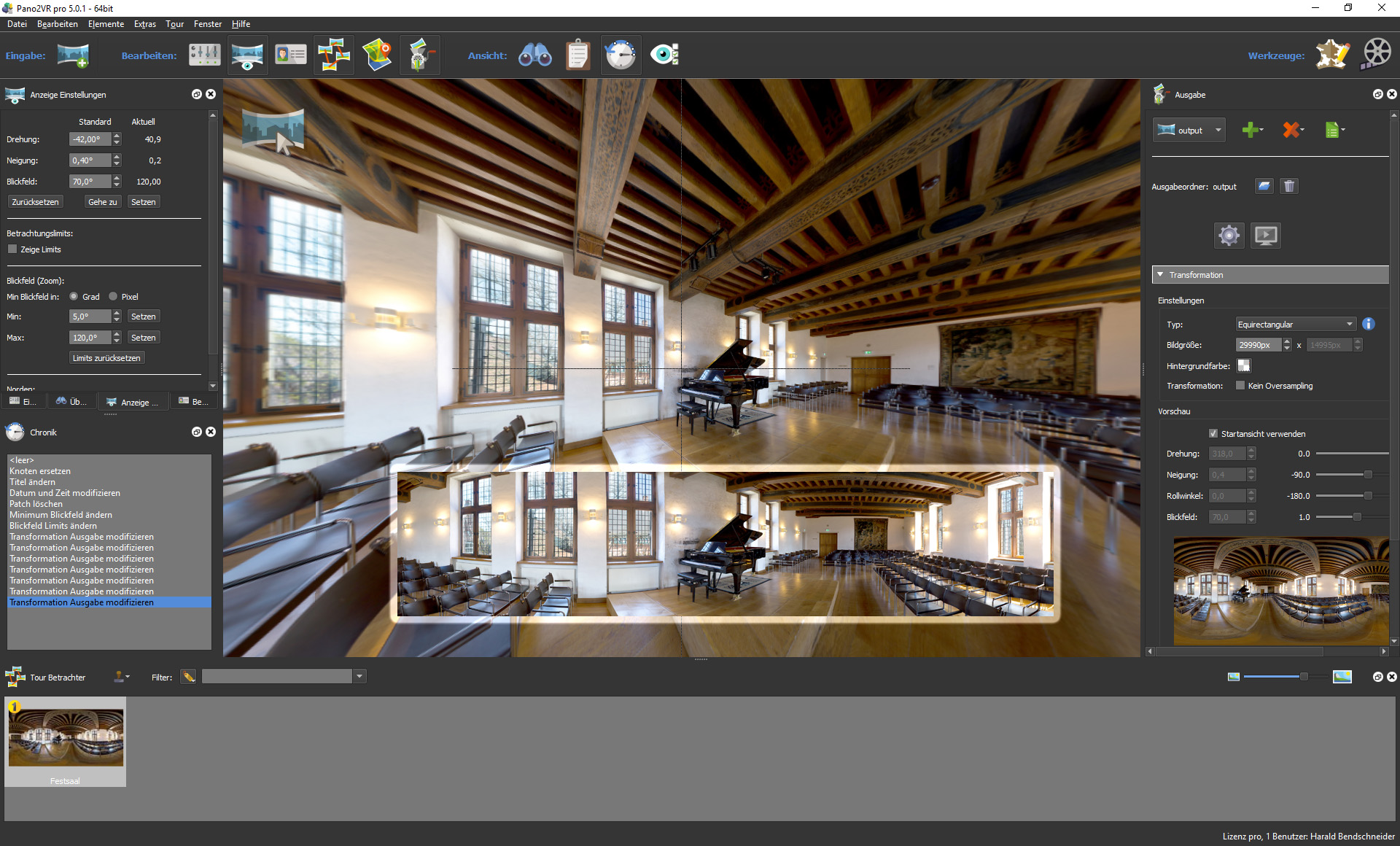 Mit PanoVR hat man eine Vielzahl von Möglichkeiten als Rectilinear mit den Einstellungen Drehung, Neigung, Querneigung, Blickfeld; Größe und Auflösung usw. das equirectangulare Original-Panorama zu verändern und auch Einzelbilder herauszuziehen. Für die Einzelbilder sollte man aber mehr als 10.000 Pixel in der Breite haben um auf eine anständige Auflösung zu kommen, bei einer Breite des Originals mit über 30.000 kann man locker 30-50 MP Bilder abziehen.