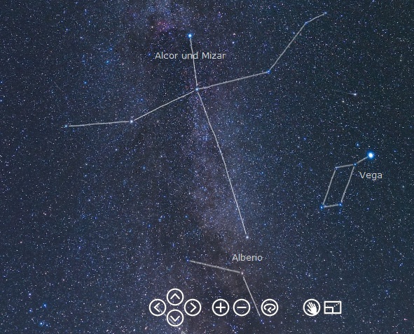 Also bin ich in der Dunkelheit in wohl nicht ganz angemessenem Tempo über unbefestigte Wege gebrettert, nur um doch keinen anständigen Standort zu finden. Am Ende bin ich dann auf einem abgeernteten Kartoffelacker gelandet. Egal, ich hab das Pano noch 20' vor Mondaufgang hinbekommen. So richtig überragend ist es nicht, auch wegen des grünen Airglows. Darum habe ich ein klein wenig rumgebastelt und noch ein paar Dinge anklick- und einblendbar gemacht.