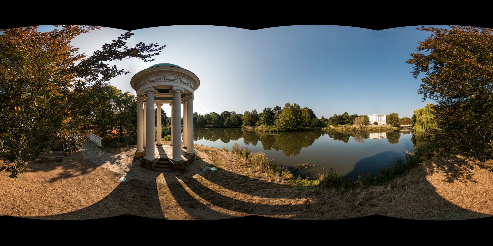 Ja 4 Bilder reichen, wenn man einigermaßen genau die 90° Stellen trifft. Ich habe mir dazu am Fuß der Stange eine Markierung angebracht und stelle das Teil dann auf eine CD mit einem aufgemaltem 90° Kreuz. So hat man auch im Gras oder anderswo, wo keine natürlichen festen Markierungen sind, einen guten Anhaltspunkt für die Stopps. Der Blickwinkel beträgt horizontal so ca. 105° (o.ä.), also reicht es. Hier der Beweis:Kommst Du tatsächlich mit 4 Bildern aus? Wieviel Überlappung hast Du dann?