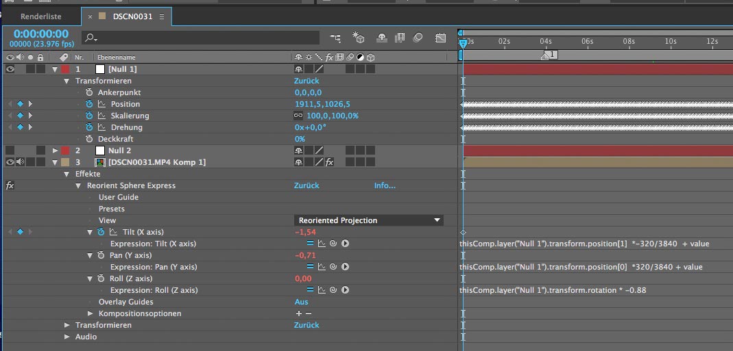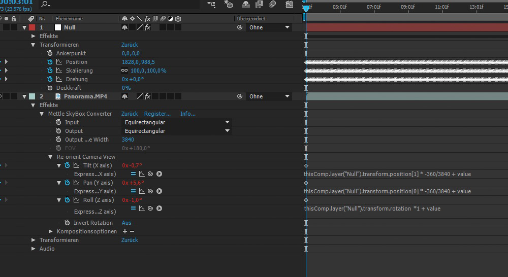 4. Für den Korrektur-Schritt braucht man leider ein Plugin, was erlaubt in After Effects Pan, Tilt und Roll zu ändern - Standard bei Panoramen.