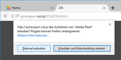 Bei mir kam die Aufforderung dem FlashPlayerPlugin den start zu erlauben. Danach konnte ich Dein neues Panorama anschauen. Wenn ich aber vom Panorama Tab zum Forum Tab wechsle und umgekehrt dann Bleibt das Panorama Tab stehen(keine Reaktion der maus, Ton