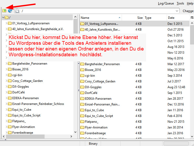 Mit diesem DSL-Zugang wähle ich mich über Waterfox und der Fire-FTP-App (oder mit Filezilla) in das Wurzelverzeichnis meiner Domain http://www.pano.szenerien.de ein und erzeuge dort einen neuen Ordner mit dem Namen meiner Tour.